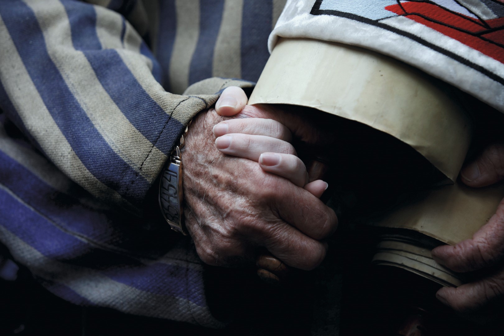 Fotografía de Kacper Pempel, en la “Marcha Anual de los Vivos” que conmemora el Holocausto en el antiguo campo de exterminio nazi de Auschwitz. Edward Mosberg, sobreviviente del Holocausto, sostiene la mano de su nieta Jordana Karger en la “Marcha Anual de los Vivos”.